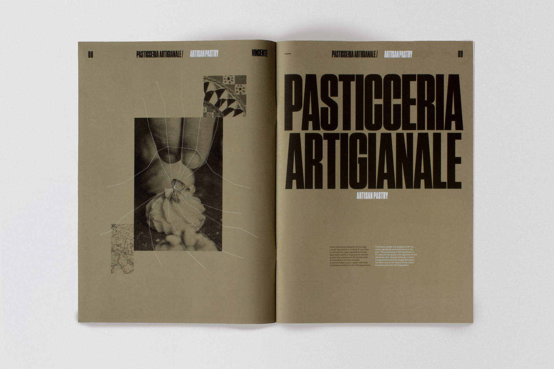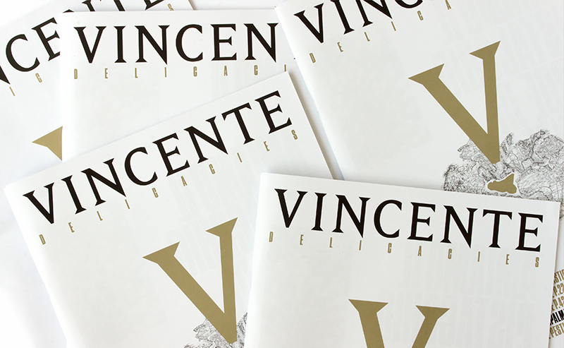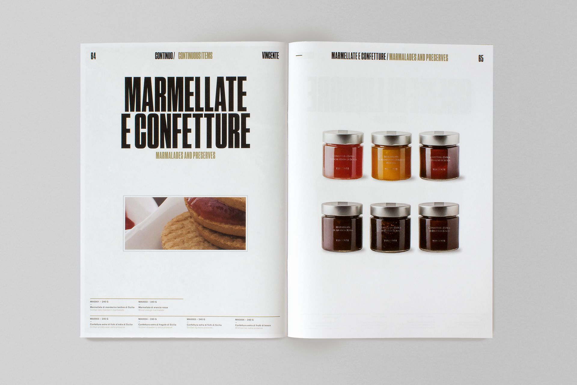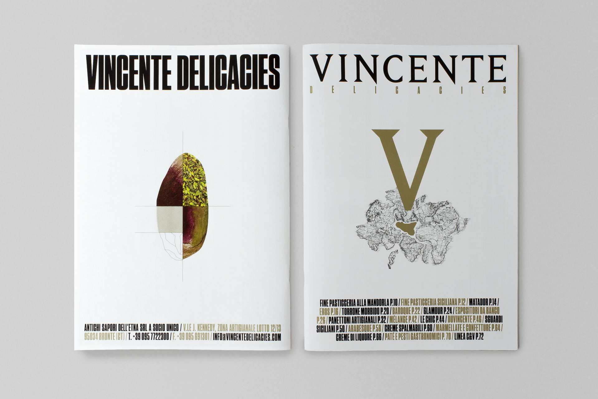 Il catalogo prodotti ideato per Vincente Delicacies, azienda siciliana leader nel settore dolciario, vuole conciliare la funzionalità di uno strumento commerciale indispensabile con l’altrettanto ambita esigenza di una catalogazione luminosa, fresca ed appetibile dei prodotti. Il risultato richiama nel formato e al tatto un albo, con un approccio visivo giornalistico e ha come unica concessione alla ricchezza dei prodotti l’uso dell’oro nella stampa.