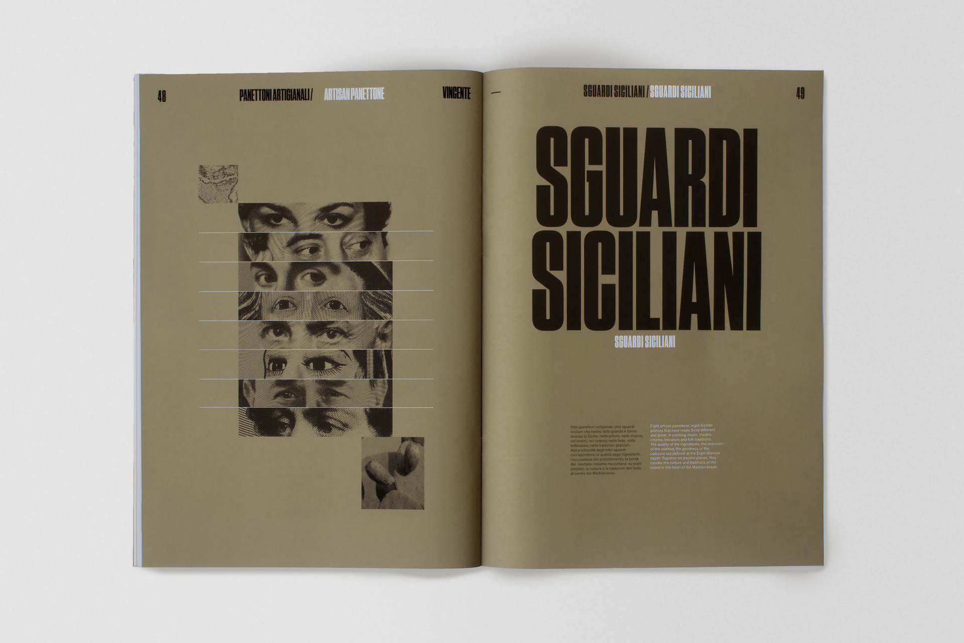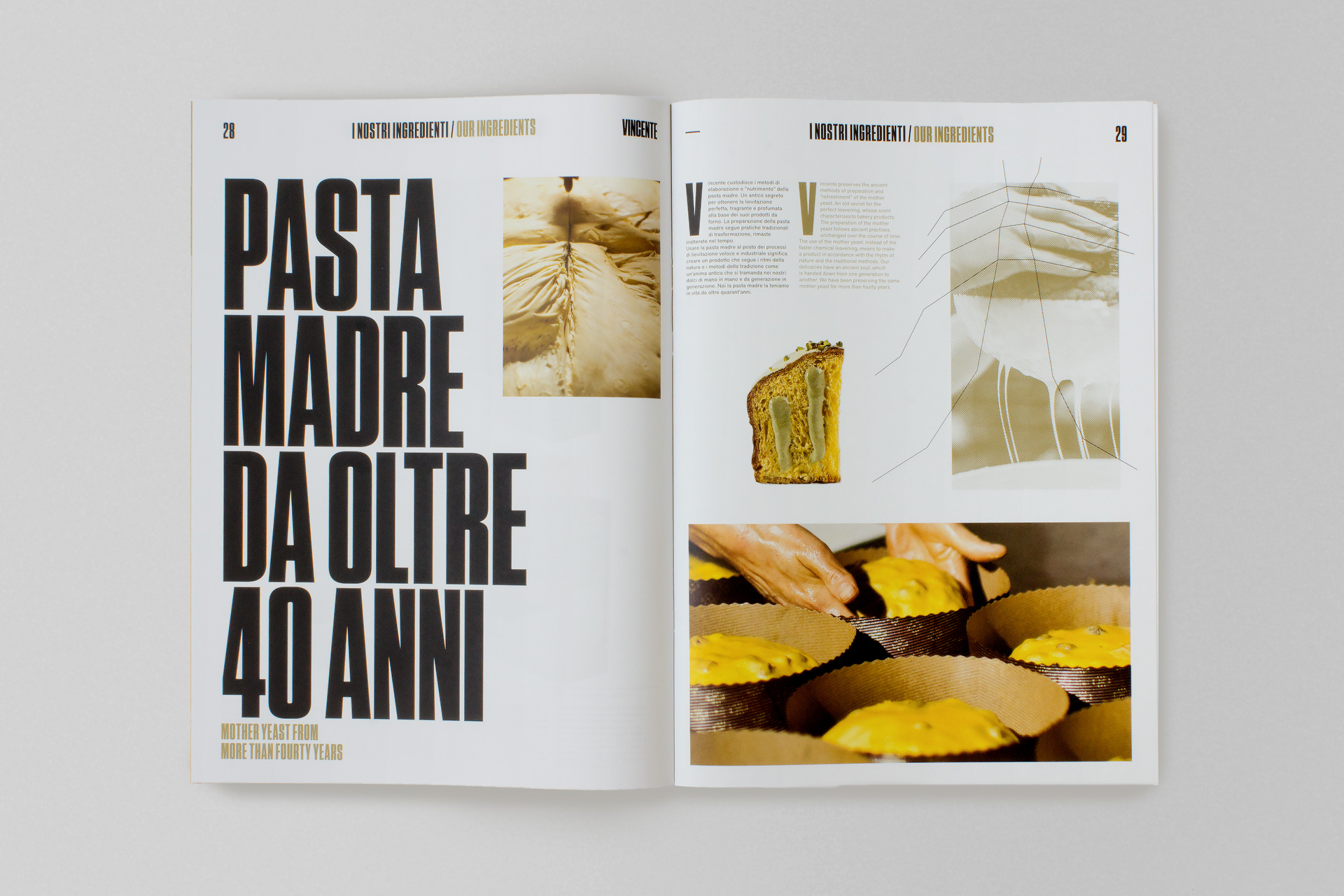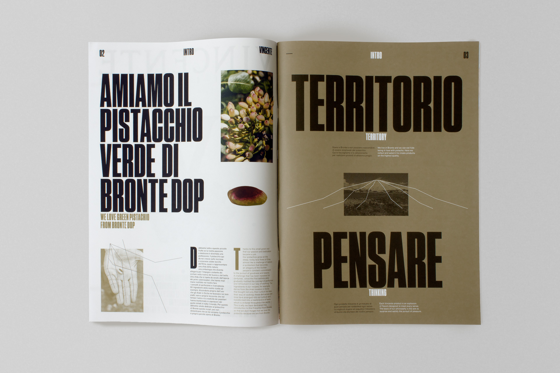 Il catalogo prodotti ideato per Vincente Delicacies, azienda siciliana leader nel settore dolciario, vuole conciliare la funzionalità di uno strumento commerciale indispensabile con l’altrettanto ambita esigenza di una catalogazione luminosa, fresca ed appetibile dei prodotti. Il risultato richiama nel formato e al tatto un albo, con un approccio visivo giornalistico e ha come unica concessione alla ricchezza dei prodotti l’uso dell’oro nella stampa.